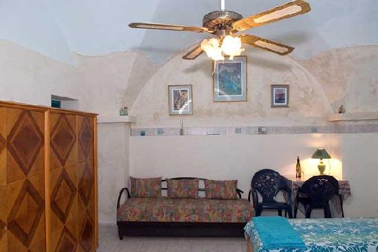atmosphere. An air conditioner and overhead fan keeps the room cool in summer,